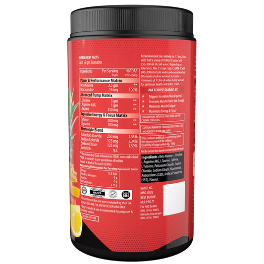 Naturyz Surge 4X Pre-Workout Formula is an all-around pre-workout formula engineered for high-intensity training. Each scoop (≈15 g) delivers: