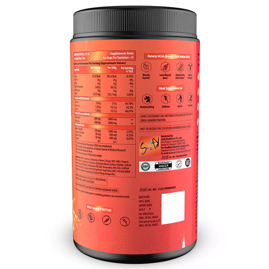 Naturyz BCAA Energy Blast delivers a potent 7000 mg of pure vegetarian instantized BCAAs in the scientifically proven 2:1 ratio (Leucine:Isoleucine + Valine) to prevent muscle breakdown, enhance endurance, and speed up recovery. It’s further powered with L-Glutamine for muscle repair, L-Citrulline and Beta-Alanine for pump and sustained performance, and electrolytes (sodium and potassium) to maintain hydration during intense training.